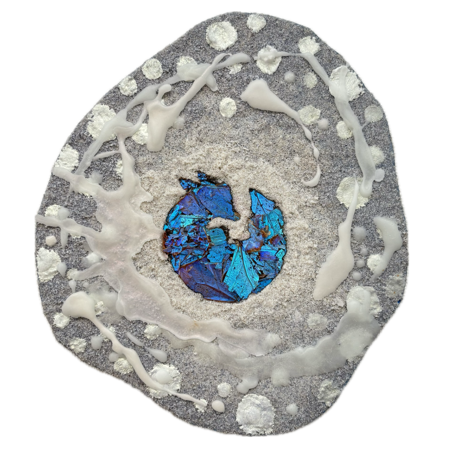 『煙石-アオシャクガ』約20×15(㎝)<br> 太陽の元で羽ばたく蝶を好み、ヒトの作る光に集まる蛾を嫌う。人間は自分達の行いが嫌いなのだろうか。